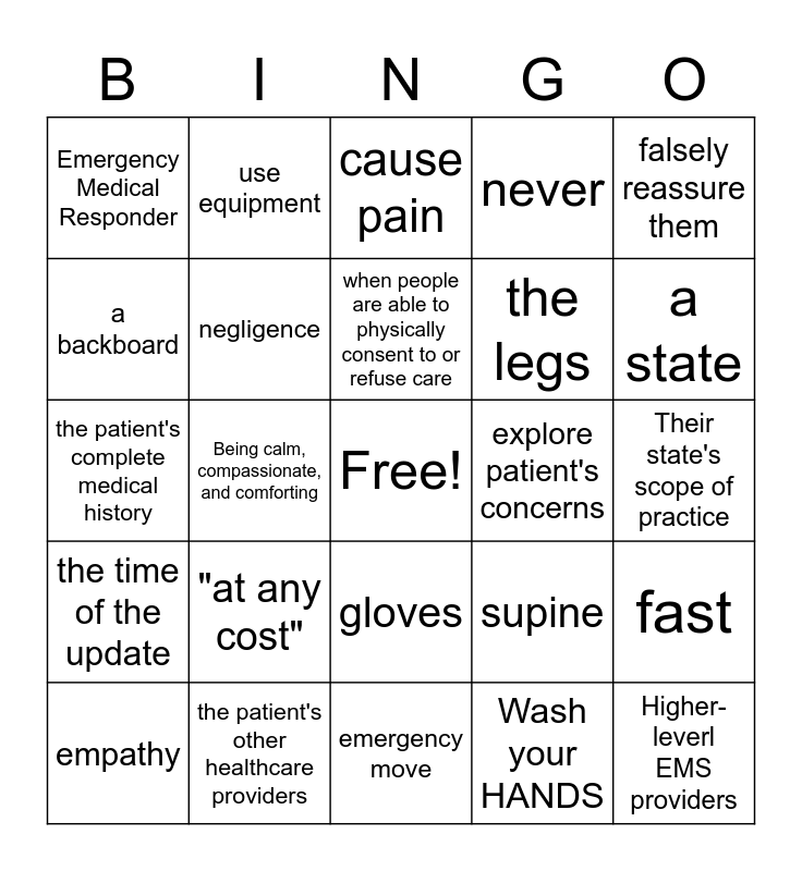 This bingo card has a free space and 27 words: supine, wheeled stretcher, the legs, emergency move, a backboard, cause pain, use equipment, the time of the update, explore patient's concerns, fast, the patient's complete medical history, never, empathy, the patient's other healthcare providers, a state, of the age of majority, negligence, when people are able to physically consent to or refuse care, "at any cost", Emergency Medical Responder, Their state's scope of practice, Wash your HANDS, Being calm, compassionate, and comforting, Higher-leverl EMS providers, gloves, falsely reassure them and wait to care for patients after special responders have deterined the scene to be safe.