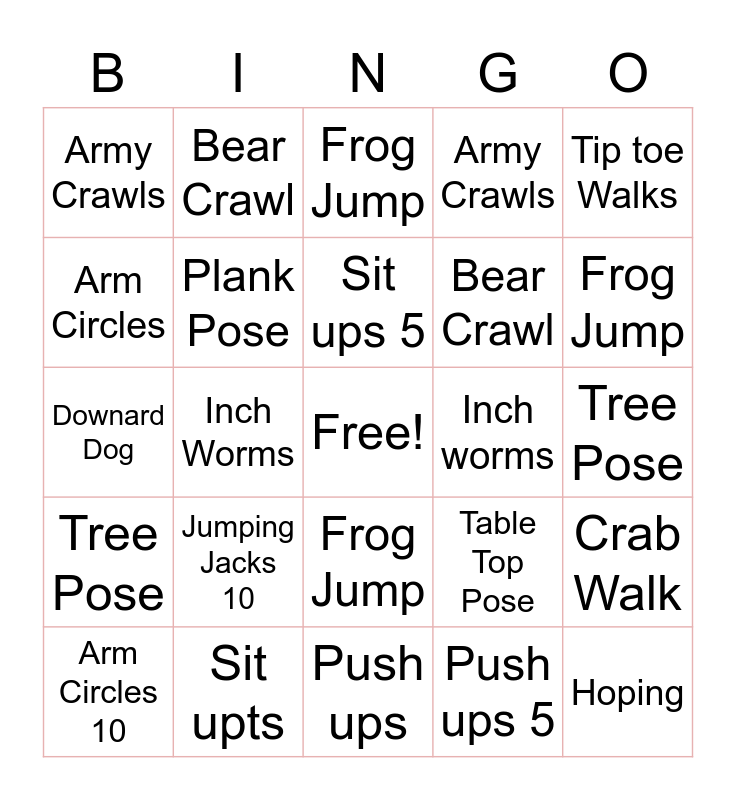 This bingo card has a free space and 24 words: Arm Circles 10, Jumping Jacks 10, Sit ups 5, Push ups 5, Tip toe Walks, Army Crawls, Bear Crawl, Frog Jump, Inch worms, Tree Pose, Downard Dog, Plank Pose, Table Top Pose, Crab Walk, Arm Circles, Sit upts, Push ups, Army Crawls, Frog Jump, Tree Pose, Inch Worms, Frog Jump, Bear Crawl and Hoping.