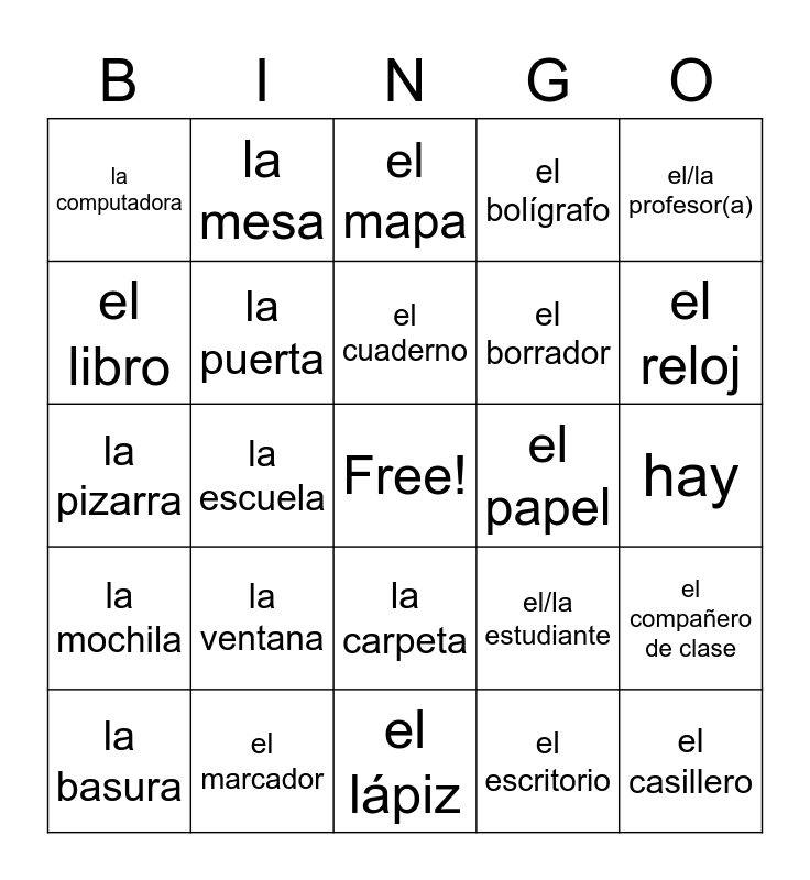 This bingo card has a free space and 28 words: el compañero de clase, el profesor, el borrador, el escritorio, el libro, el mapa, la mesa, la mochila, el papel, la basura, la pizarra, el bolígrafo, el marcador, el lápiz, el reloj, la silla, la ventana, la puerta, el cuaderno, la carpeta, la computadora, la bandera, el casillero, la escuela, hay, el/la estudiante, el/la profesor(a) and la calculadora.