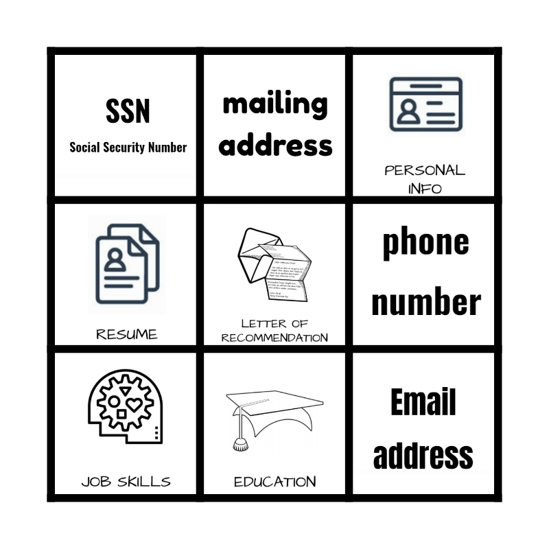 This bingo card has 11 images and a free space.