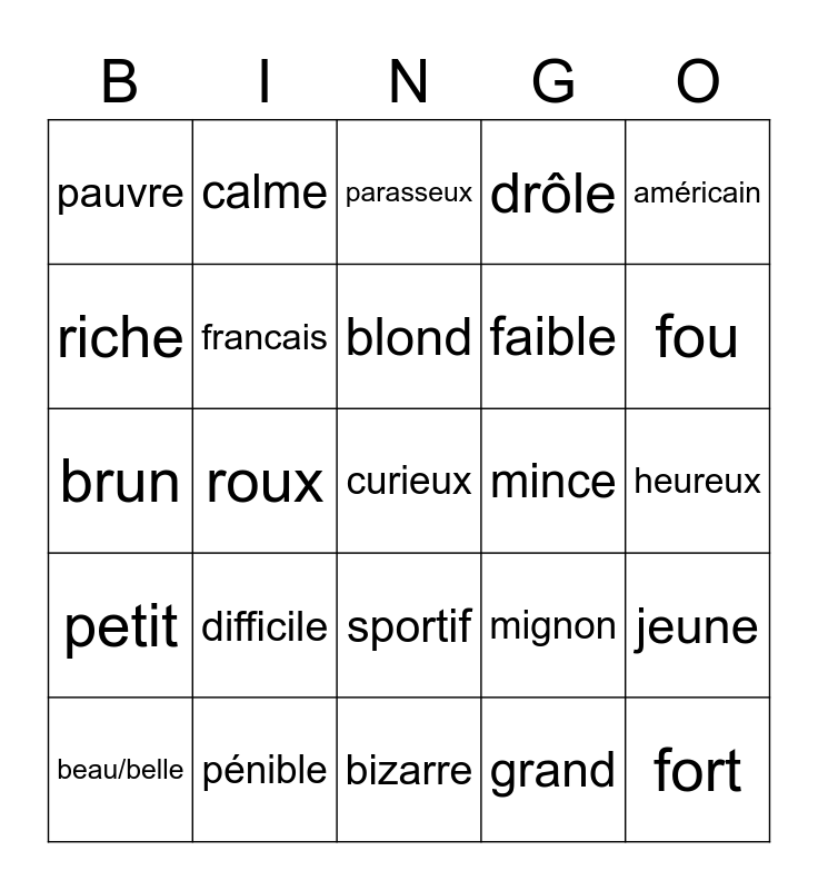 This bingo card has a free space and 32 words: grand, timide, roux, bavard, petit, francais, américain, jeune, calme, occupé, blond, parasseux, intelligent, méchant, mince, patient, beau/belle, brun, sportif, difficile, mignon, sympa, heureux, pénible, fort, drôle, faible, riche, pauvre, bizarre, musical and fou.