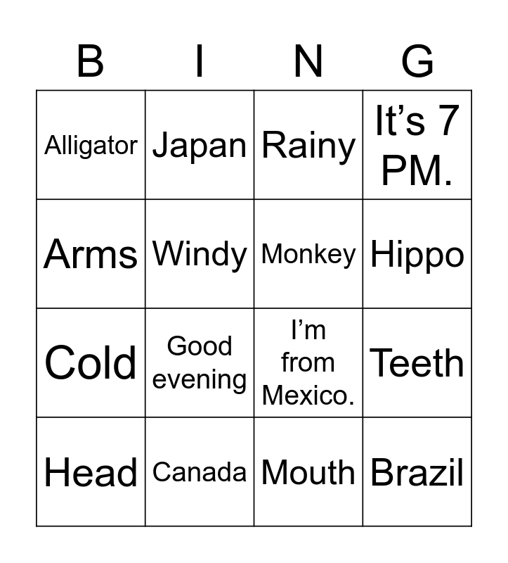 This bingo card has 28 words: Free!, Hot, Cold, Sunny, Windy, Rainy, Japan, Brazil, Canada, The United Kingdom, I’m from Mexico., It’s 7 PM., It’s half past 3., Good morning, Good evening, Good afternoon, Good night, Monkey, Hippo, Tiger, Alligator, Rat, Head, Teeth, Mouth, Feet, Arms and Legs.