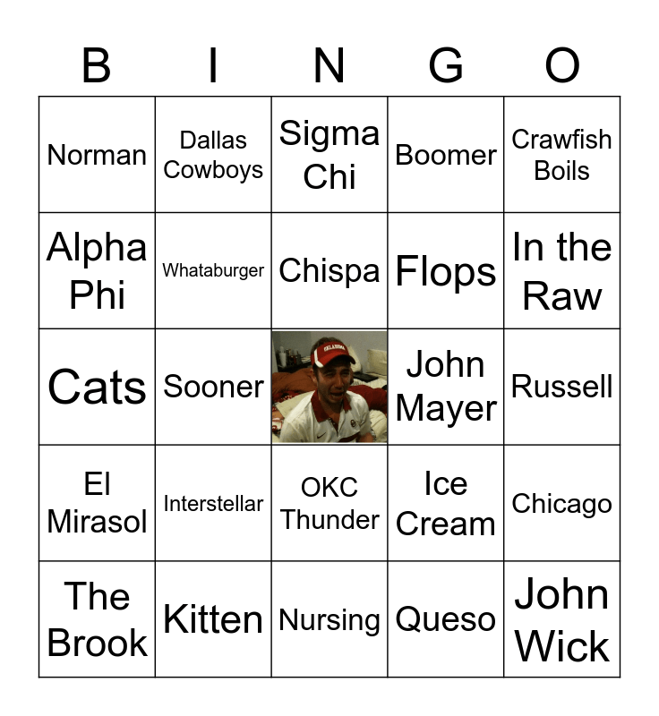 This bingo card has a free space and 89 words: Tito, Arizona, OKC Thunder, Dad, Seafood, Robert California, Braum's, AHS, Sushi, Southwest Airlines, Lost, New Orleans, Chicago, Russell, Lemongrass, Chispa, Harry Potter, Pool Party, OU, Poboys, Breaking Bad, Michael Scott, Nursing, Tulsa, Cats, Kitten, Little Fools, White Russian, Coffee, Cigar, Boomer, Sooner, Oklahoma, Norman, The Mont, Sigma Chi, Alpha Phi, Mexican Food, In the Raw, The Brook, El Mirasol, Paesano's, Gogi Street, Cheesesteaks, Ice Cream, John Mayer, New Year's Eve, Tulsa Country Club, Chelsea FC, Dallas Cowboys, Barstool, Landman, Tennis, Golf, Seahawks Room, The Meat Grinder, Sah Fool, Oklahoma City, EOG, Oil & Gas, San Antonio, TSAOG, The Office, Dwight Schrute, Pam Beasley, Jim Halpert, Kevin Malone, Stanley Hudson, The Lizard King, Interstellar, John Wick, The Interview, On the Dole, Flops, Whataburger, Queso, Calamari, Halal Guys, Board Games, Drinking Games, Crawfish Boils, Midland, Tropical Vacations, Traveling, All-Inclusive Resorts, Mexico, Jamaica, Seattle and Weak Ankles.