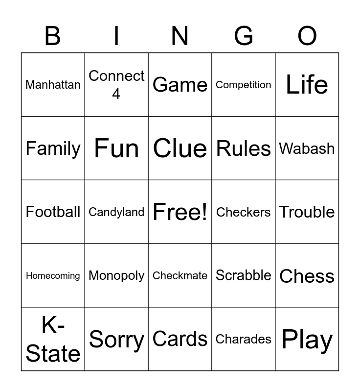 This bingo card has a free space and 24 words: Monopoly, Sorry, Clue, K-State, Life, Manhattan, Family, Connect 4, Checkers, Checkmate, Rules, Football, Scrabble, Chess, Fun, Charades, Trouble, Game, Wabash, Candyland, Play, Homecoming, Competition and Cards.