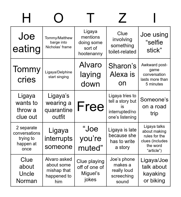 This bingo card has a free space and 26 words: “Joe you’re muted”, Joe’s phone makes a really loud screeching sound, Alvaro laying down, Alvaro asked about some mishap that happened to him, Joe using “selfie stick”, Joe eating, Tommy cries, Tommy/Matthew barge into Nicholas’ frame, Someone’s on a road trip, Ligaya is late because she has to write a story, Sharon’s Alexa is on, Ligaya wants to throw a clue out, Ligaya talks about making rules for the clues (includes the word “article”), Clue about Uncle Norman, Ligaya’s wearing a quarantine outfit, Alliteration clue, Clue involving something toilet-related, 2 separate conversations trying to happen at once, Ligaya mentions doing some sort of hootenanny, Ligaya/Joe talk about kayaking or biking, Awkward post-game conversation lasts more than 5 minutes, Clue playing off of one of Miguel’s jokes, Ligaya tries to tell a story but is interrupted/no one’s listening, Ligaya interrupts someone, Ligaya/Delphine start singing and Ligaya mentions/puts in a clue about the bug cake.