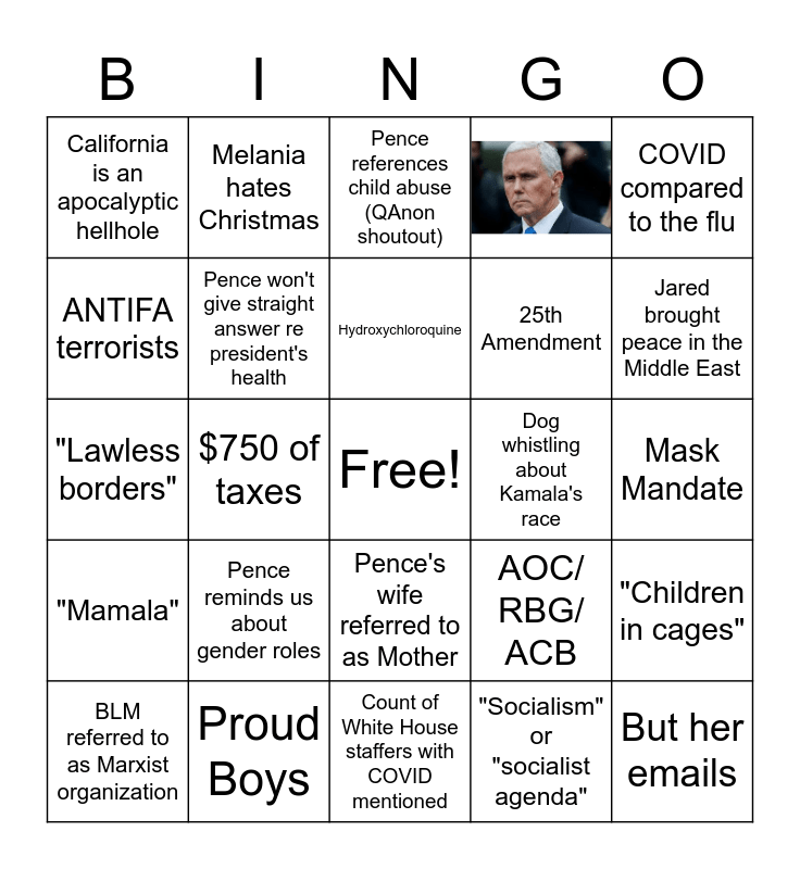 This bingo card has 1 images, a free space and 25 words: Pence's wife referred to as Mother, "Socialism" or "socialist agenda", Hydroxychloroquine, Proud Boys, COVID compared to the flu, California is an apocalyptic hellhole, ANTIFA terrorists, Melania hates Christmas, Mask Mandate, AOC/ RBG/ ACB, 25th Amendment, "Lawless borders", "Children in cages", BLM referred to as Marxist organization, $750 of taxes, The stock market is so good though!, "Mamala", Pence references child abuse (QAnon shoutout), But her emails, Jared brought peace in the Middle East, Count of White House staffers with COVID mentioned, Dog whistling about Kamala's race, Pence reminds us about gender roles, Pence won't give straight answer re president's health and Pence talks about the evils of Plexiglass.