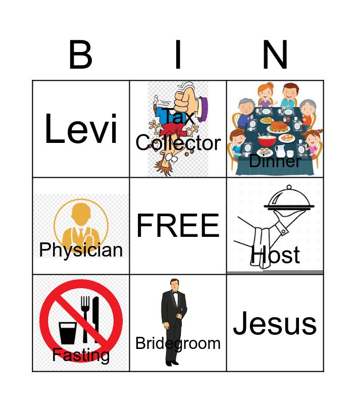 This bingo card has 6 images, a free space and 8 words: Host, Dinner, Tax Collector, Fasting, Levi, Jesus, Physician and Bridegroom.