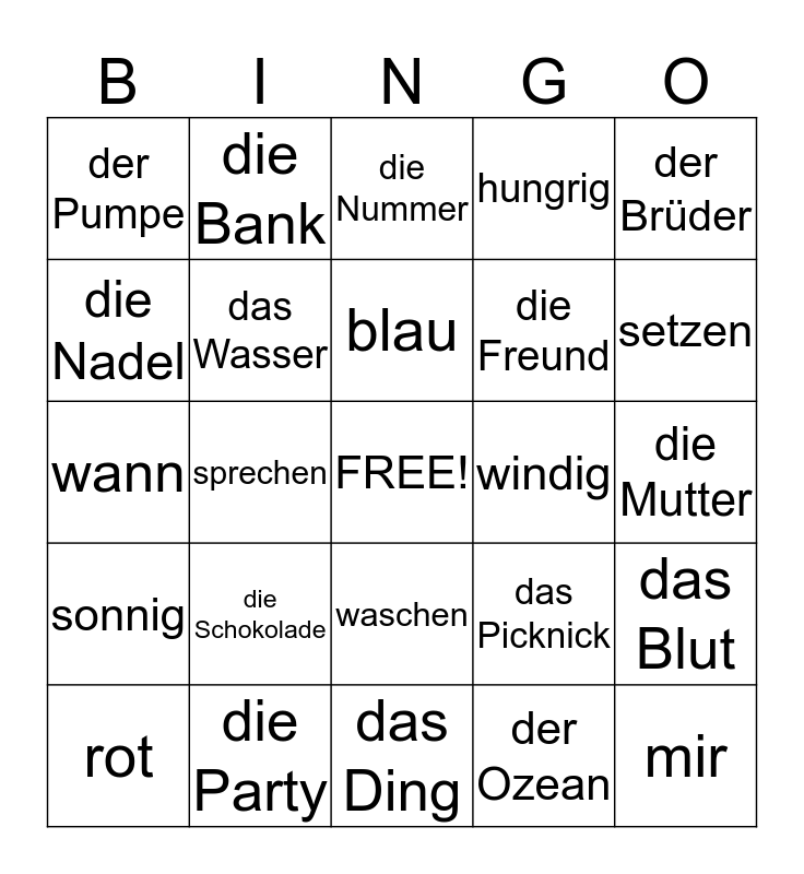 This bingo card has a free space and 24 words: die Schokolade, die Party, blau, rot, der Brüder, der Pumpe, die Nadel, die Bank, windig, waschen, die Freund, wann, das Picknick, das Blut, das Wasser, der Ozean, die Mutter, die Nummer, setzen, sprechen, mir, sonnig, hungrig and das Ding.