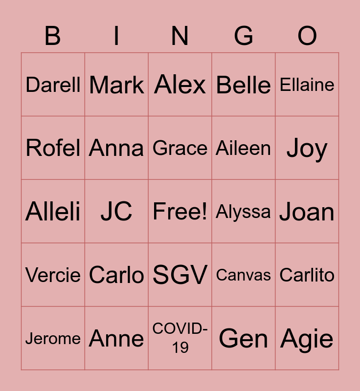This bingo card has a free space and 59 words: GAM, Anne, Daryl, Vercie, Gen, Fe, Anna, Ciandro, Aileen, Icy, Belle, Margie, Rofel, Janiel, Pao, Darell, Agie, Ellaine, Josemari, Grace, Alyssa, Alex, Jerome, Carlito, Jovern, Zha, Shyne, Emerson, Joy, Nica, Krisnelle, Daph, Helen, Leo, Mark, Alyssa, Lady, JC, Shaznay, Alleli, Rhene, Carlo, Joan, Hope, bHi3, Baby, Jowa, WFH, SGV, COVID-19, ECQ, MECQ, GCQ, Walang Forever, Friendzone, Canvas, Atlas, Bonus and Sana All.