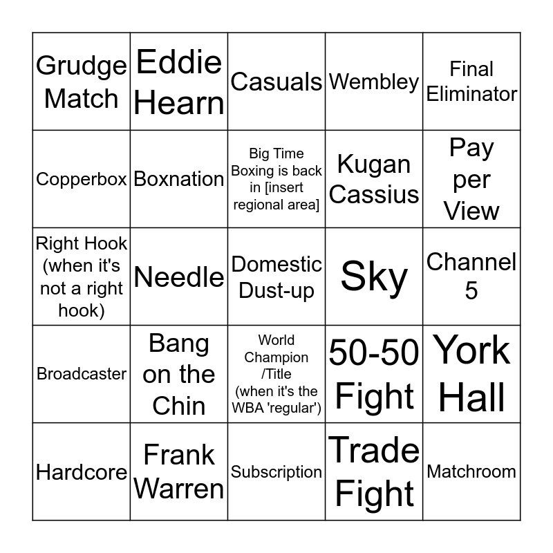 This bingo card has 25 words: Bang on the Chin, Subscription, Big Time Boxing is back in [insert regional area], Hardcore, Final Eliminator, Grudge Match, Copperbox, Eddie Hearn, Sky, World Champion /Title (when it's the WBA 'regular'), Kugan Cassius, Right Hook (when it's not a right hook), 50-50 Fight, York Hall, Boxnation, Matchroom, Channel 5, Casuals, Pay per View, Needle, Domestic Dust-up, Frank Warren, Broadcaster, Wembley and Trade Fight.