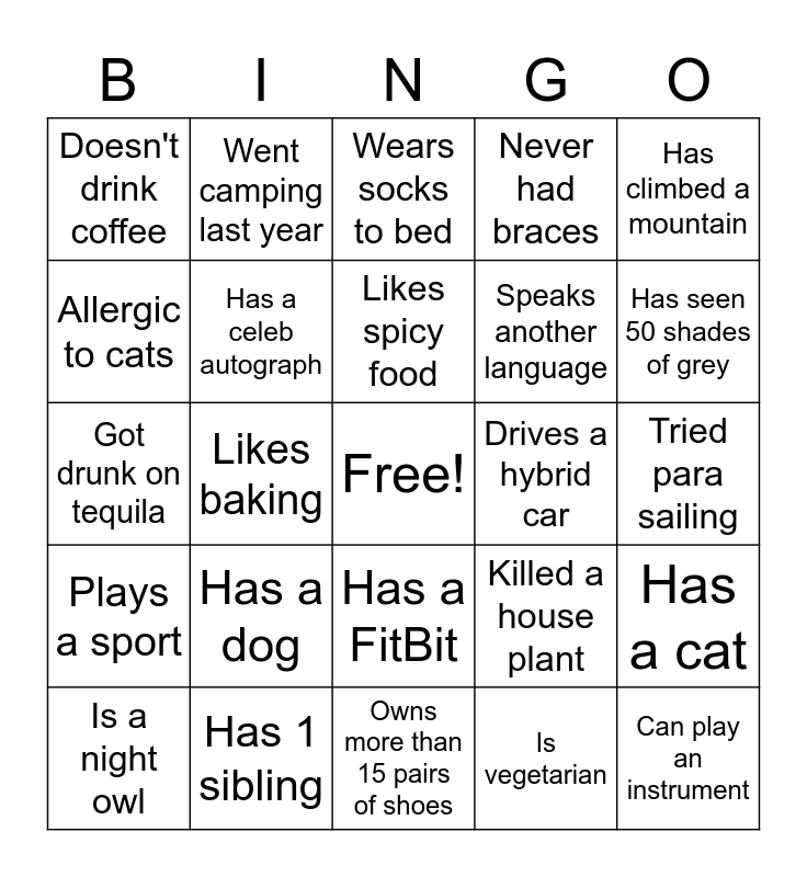 This bingo card has a free space and 24 words: Has a dog, Has 1 sibling, Likes spicy food, Is a night owl, Has climbed a mountain, Doesn't drink coffee, Allergic to cats, Went camping last year, Drives a hybrid car, Has a FitBit, Speaks another language, Got drunk on tequila, Killed a house plant, Has a cat, Has a celeb autograph, Is vegetarian, Tried para sailing, Wears socks to bed, Has seen 50 shades of grey, Likes baking, Can play an instrument, Plays a sport, Never had braces and Owns more than 15 pairs of shoes.