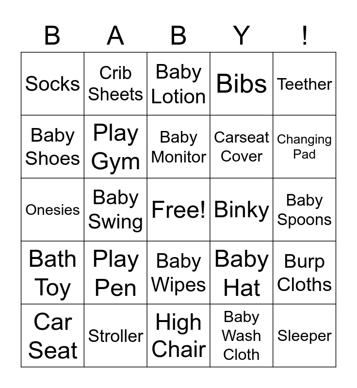 This bingo card has a free space and 34 words: Stuffed Animal, Baby Wash Cloth, Baby Powder, Baby Rattle, Bath Toy, Play Gym, Teether, Car Seat, Crib Sheets, Baby Soap, Baby Monitor, Baby Lotion, Story Book, Bottle, Binky, Changing Pad, Stroller, Onesies, Play Pen, Baby Hat, Baby Wipes, Diaper Cream, Socks, Baby Spoons, High Chair, Sleeper, Bibs, Diaper Bag, Carseat Cover, Baby Shoes, Booger Sucker, Baby Swing, Burp Cloths and Hooded Towel.