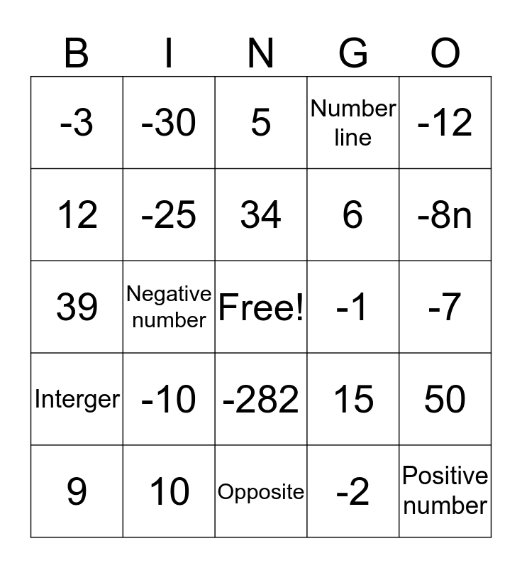 This bingo card has a free space and 24 words: -10, 10, 34, 9, -12, -3, 12, -30, -1, -282, 6, 39, 15, 50, -25, -2, -7, 5, -8n, Negative number, Positive number, Interger, Number line and Opposite.