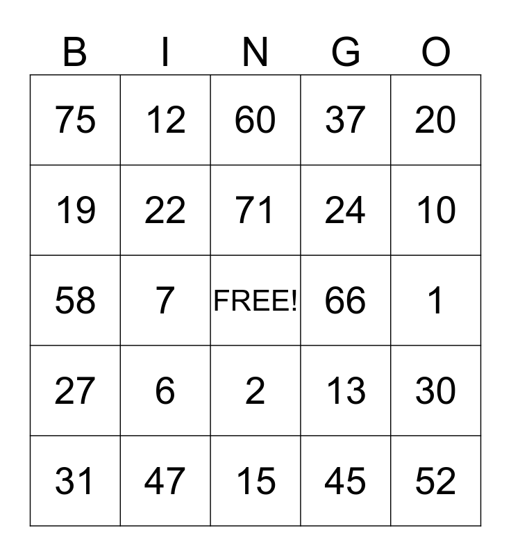 This bingo card has a free space and 24 words: 6, 47, 71, 31, 20, 75, 19, 12, 66, 2, 24, 58, 13, 30, 22, 45, 1, 60, 10, 7, 52, 27, 37 and 15.