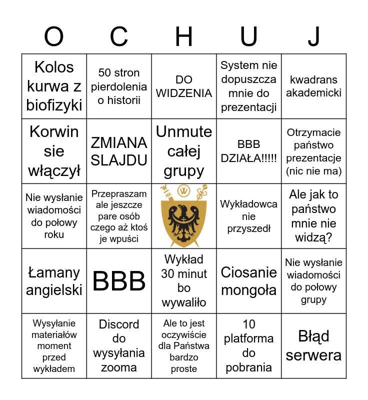 This bingo card has a free space and 24 words: BBB, Discord do wysyłania zooma, Unmute całej grupy, Wysyłanie materiałów moment przed wykładem, kwadrans akademicki, Kolos kurwa z biofizyki, Korwin sie włączył, 50 stron pierdolenia o historii, Wykładowca nie przyszedł, Wykład 30 minut bo wywaliło, BBB DZIAŁA!!!!!, Nie wysłanie wiadomości do połowy roku, Ciosanie mongoła, Nie wysłanie wiadomości do połowy grupy, ZMIANA SLAJDU, 10 platforma do pobrania, Ale jak to państwo mnie nie widzą?, DO WIDZENIA, Otrzymacie państwo prezentacje (nic nie ma), Przepraszam ale jeszcze pare osób czego aż ktoś je wpuści, Błąd serwera, Łamany angielski, System nie dopuszcza mnie do prezentacji and Ale to jest oczywiście dla Państwa bardzo proste.