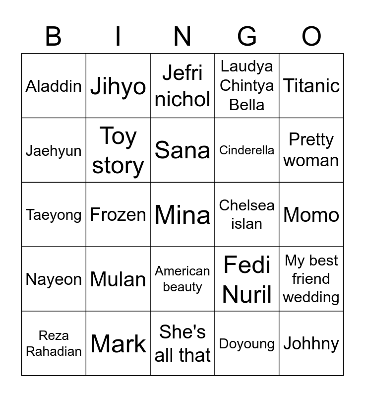 This bingo card has a free space and 24 words: Mulan, Mark, Sana, Reza Rahadian, Titanic, Aladdin, Jaehyun, Jihyo, Chelsea islan, American beauty, Cinderella, Taeyong, Fedi Nuril, My best friend wedding, Toy story, Doyoung, Momo, Jefri nichol, Pretty woman, Frozen, Johhny, Nayeon, Laudya Chintya Bella and She's all that.