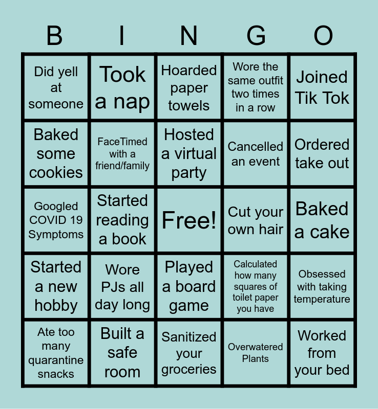 This bingo card has a free space and 56 words: Took a shower/bath daily, Ate too many quarantine snacks, Did not yell at anyone, Did yell at someone, Sanitized your groceries, Sanitized your child/pet/house., FaceTimed with a friend/family, Forgot what day it was, Cancelled an event, Actually did your hair and makeup, Wore the same outfit two times in a row, Supported Local Business, Bought groceries, Wore business shirt with PJ bottoms, Took a walk, Are a weird dinner, Joined Tik Tok, Started reading a book, Watched the movie "Outbreak" or "Pandemic", Worked from your bed, Cut your own hair, Did a live workout class online, Calculated how many squares of toilet paper you have, Hoarded paper towels, Ran out of paper towels, Hosted a virtual party, Went for a long run, Cooked A LOT!, Ordered take out, Planted something and watched it grow, Tip someone extra, Made a donation to a local non-profit, Wrote a positive review online, Bought a gift card, Baked a cake, Baked some cookies, Googled COVID 19 Symptoms, Gave in to Tiger King, Started a new hobby, Took a nap, Played a board game, Went to the mountains, Went to the beach, Said "Wash your hands", Asked "What day is it?", Wore PJs all day long, Built a safe room, Said "Bedtime, what bedtime?", Ordered groceries online, Tried to make it to "it's five o'clock" somewhere time., Overwatered Plants, Underwatered Plants, yelled at someone, Forgot how to talk to other human beings, Obsessed with taking temperature and Scare to cough in public.
