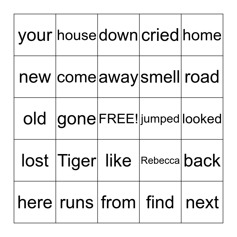 This bingo card has a free space and 24 words: Tiger, runs, away, here, home, your, new, house, jumped, like, smell, old, Rebecca, back, come, find, looked, down, road, gone, next, lost, cried and from.