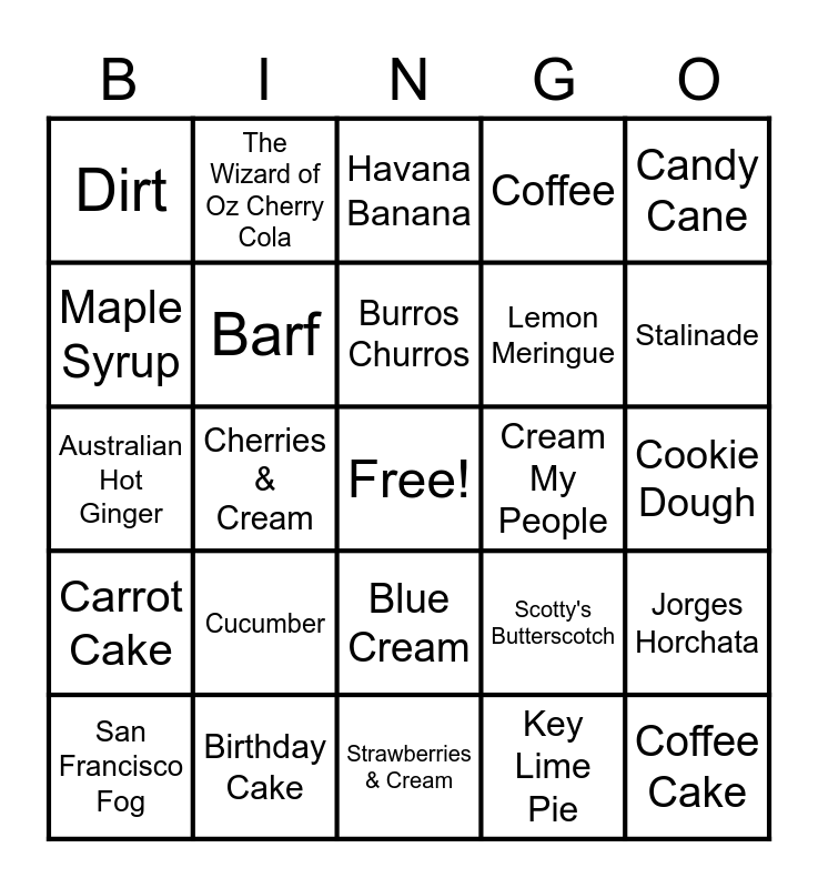 This bingo card has a free space and 40 words: Apple Pie, Australian Hot Ginger, Bacon, Barf, Birthday Cake, Blue Cream, Burros Churros, Butterscoth, Candy Cane, Carrot Cake, Cherries & Cream, Coffee, Coffee Cake, Cookie Dough, Cream My People, Cucumber, Dad-Gum-It, Dirt, Grass, Havana Banana, Jorges Horchata, Key Lime Pie, Lemon Meringue, Maple Syrup, Nuclear Orange, PBJ, Peanut Butter, Pickle Juice, Pumpkin Patch, Pumpkin Pie, Ranch, San Francisco Fog, Seal Ya Later, Scotty's Butterscotch, Stalinade, Strawberries & Cream, Strawberry Shortcake, Sweet Corn, The Wizard of Oz Cherry Cola and We Love Alie.