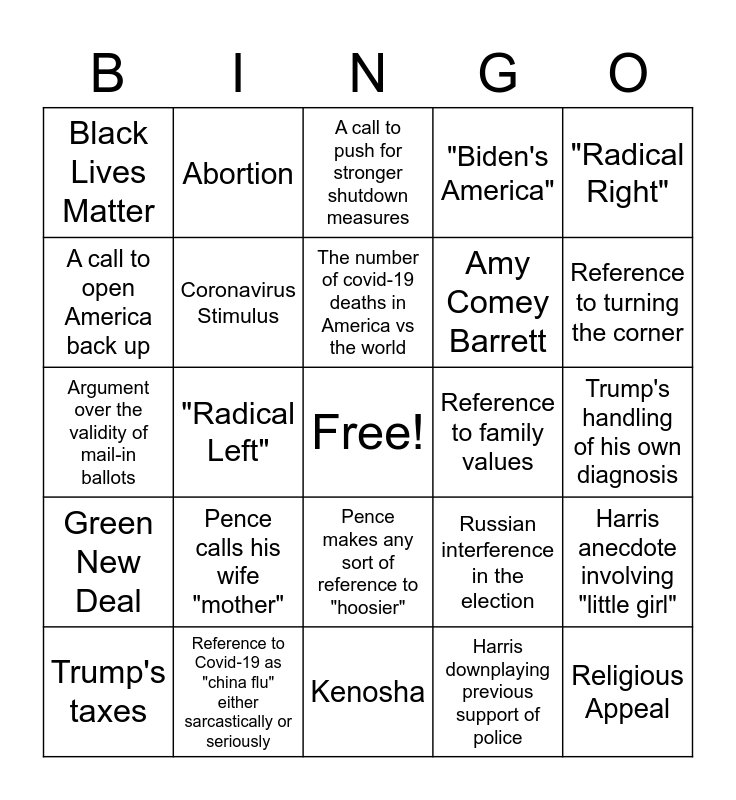 This bingo card has a free space and 24 words: Pence calls his wife "mother", Reference to Covid-19 as "china flu" either sarcastically or seriously, The number of covid-19 deaths in America vs the world, Trump's taxes, "Radical Right", Black Lives Matter, A call to open America back up, Abortion, Reference to family values, Pence makes any sort of reference to "hoosier", Amy Comey Barrett, Argument over the validity of mail-in ballots, Russian interference in the election, Harris anecdote involving "little girl", Coronavirus Stimulus, Harris downplaying previous support of police, Trump's handling of his own diagnosis, A call to push for stronger shutdown measures, Reference to turning the corner, "Radical Left", Religious Appeal, Green New Deal, "Biden's America" and Kenosha.