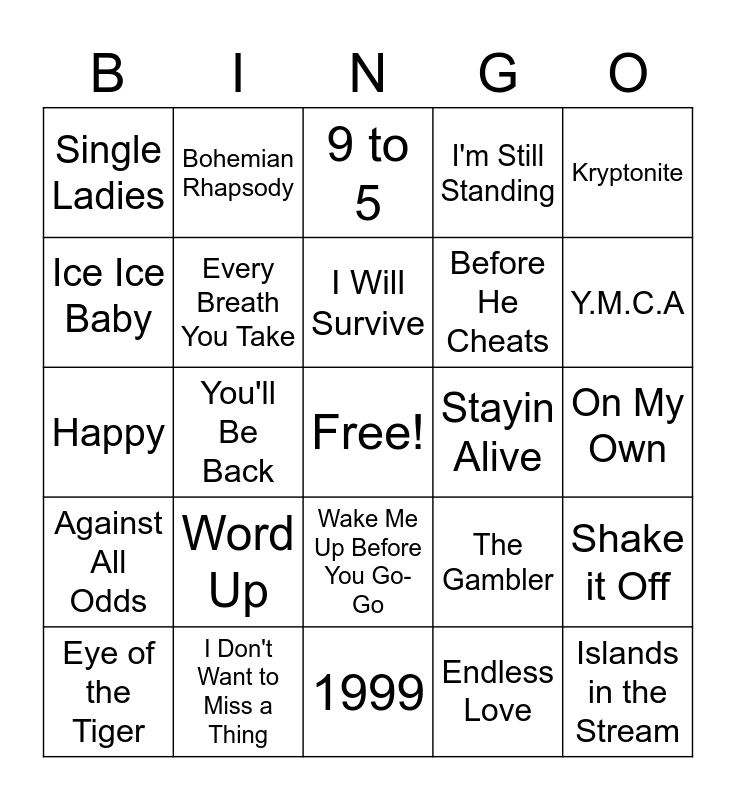 This bingo card has a free space and 24 words: Word Up, I Don't Want to Miss a Thing, I Will Survive, Eye of the Tiger, Kryptonite, Single Ladies, Ice Ice Baby, Bohemian Rhapsody, Stayin Alive, Wake Me Up Before You Go-Go, Before He Cheats, Happy, The Gambler, Shake it Off, Every Breath You Take, Endless Love, On My Own, 9 to 5, Y.M.C.A, You'll Be Back, Islands in the Stream, Against All Odds, I'm Still Standing and 1999.