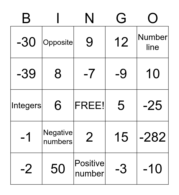 This bingo card has a free space and 24 words: Negative numbers, 50, -7, -2, Number line, -30, -39, Opposite, 5, 2, -9, Integers, 15, -282, 8, -3, -25, 9, 10, 6, -10, -1, 12 and Positive number.
