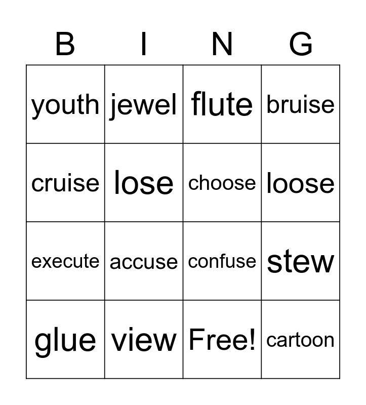 This bingo card has 17 words: Free!, glue, flute, youth, accuse, bruise, stew, choose, loose, lose, view, confuse, cruise, jewel, execute, route and cartoon.