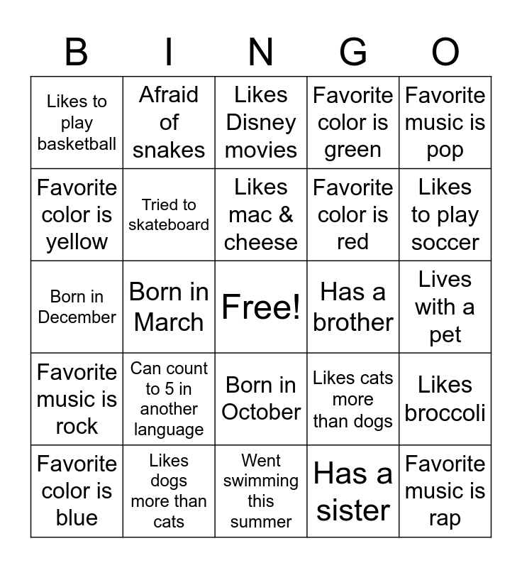 This bingo card has a free space and 24 words: Can count to 5 in another language, Likes dogs more than cats, Likes mac & cheese, Favorite color is blue, Favorite music is pop, Likes to play basketball, Favorite color is yellow, Afraid of snakes, Has a brother, Born in October, Favorite color is red, Born in December, Likes cats more than dogs, Likes broccoli, Tried to skateboard, Has a sister, Lives with a pet, Likes Disney movies, Likes to play soccer, Born in March, Favorite music is rap, Favorite music is rock, Favorite color is green and Went swimming this summer.
