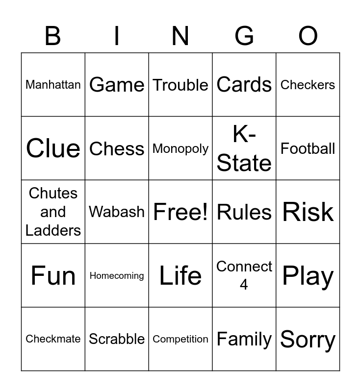 This bingo card has a free space and 24 words: Homecoming, Scrabble, Monopoly, Checkmate, Checkers, Manhattan, Clue, Game, Rules, Life, K-State, Chutes and Ladders, Connect 4, Play, Chess, Family, Risk, Trouble, Football, Wabash, Sorry, Fun, Cards and Competition.