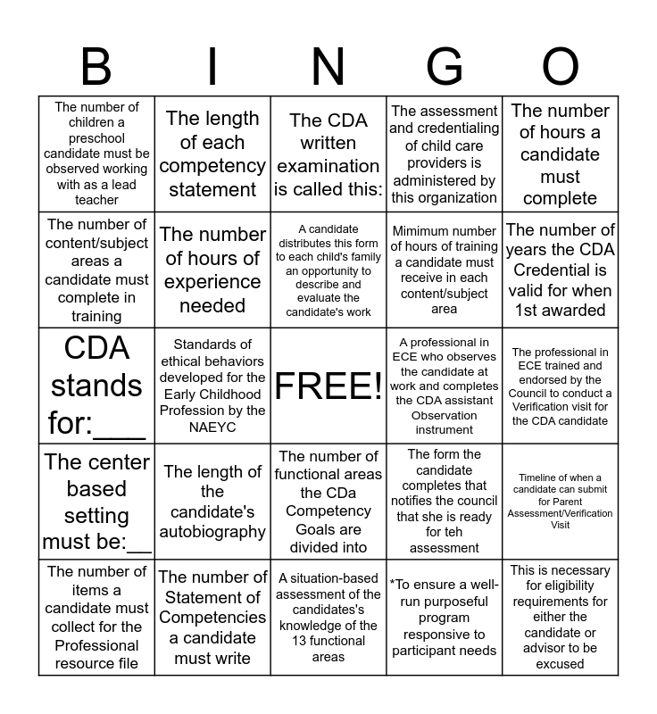 This bingo card has a free space and 24 words: The length of the candidate's autobiography, The number of Statement of Competencies a candidate must write, A candidate distributes this form to each child's family an opportunity to describe and evaluate the candidate's work, The number of items a candidate must collect for the Professional resource file, The number of hours a candidate must complete, The number of children a preschool candidate must be observed working with as a lead teacher, The number of content/subject areas a candidate must complete in training, The length of each competency statement, A professional in ECE who observes the candidate at work and completes the CDA assistant Observation instrument, The number of functional areas the CDa Competency Goals are divided into, Mimimum number of hours of training a candidate must receive in each content/subject area, CDA stands for:___, The form the candidate completes that notifies the council that she is ready for teh assessment, Timeline of when a candidate can submit for Parent Assessment/Verification Visit, The number of hours of experience needed, *To ensure a well-run purposeful program responsive to participant needs, The professional in ECE trained and endorsed by the Council to conduct a Verification visit for the CDA candidate, The CDA written examination is called this:, The number of years the CDA Credential is valid for when 1st awarded, Standards of ethical behaviors developed for the Early Childhood Profession by the NAEYC, This is necessary for eligibility requirements for either the candidate or advisor to be excused, The center based setting must be:__, The assessment and credentialing of child care providers is administered by this organization and A situation-based assessment of the candidates's knowledge of the 13 functional areas.