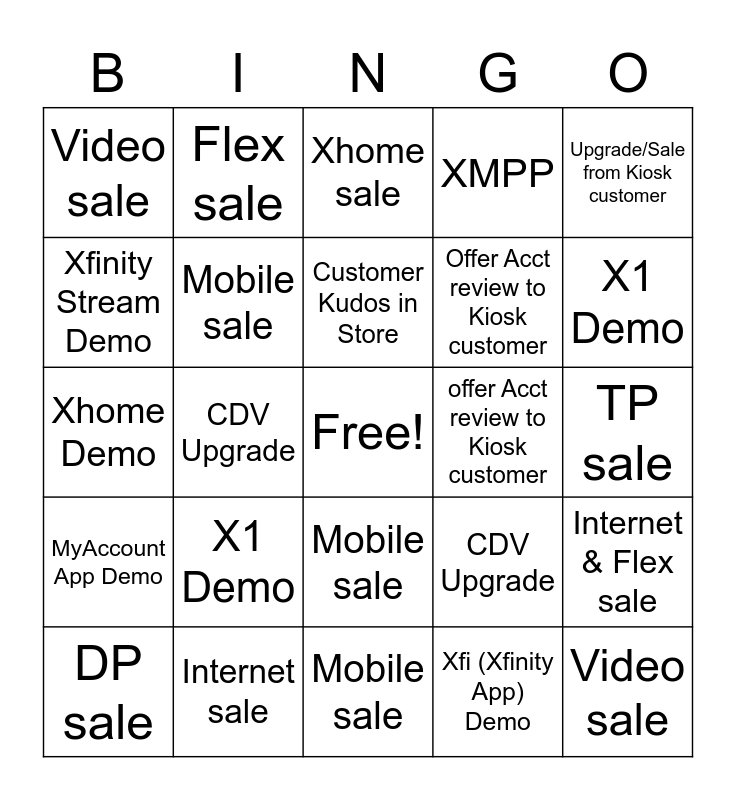 This bingo card has a free space and 24 words: X1 Demo, Internet sale, Customer Kudos in Store, DP sale, Upgrade/Sale from Kiosk customer, Video sale, Xfinity Stream Demo, Flex sale, offer Acct review to Kiosk customer, Mobile sale, Offer Acct review to Kiosk customer, Xhome Demo, CDV Upgrade, Internet & Flex sale, Mobile sale, Xfi (Xfinity App) Demo, TP sale, Xhome sale, X1 Demo, CDV Upgrade, Video sale, MyAccount App Demo, XMPP and Mobile sale.