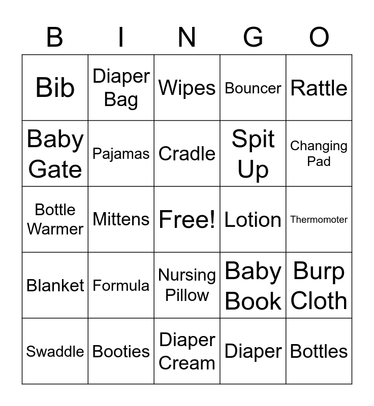 This bingo card has a free space and 44 words: Baby, Bottles, Pacifier, Swaddle, Crib, Diaper, Wipes, Nursery, Rattle, Booties, Bouncer, Lotion, Nursing Pillow, Formula, Baby Powder, Diaper Cream, Stroller, Bottle Warmer, Car Seat, Changing Pad, Diaper Bag, Baby Monitor, Onesie, Bib, Mobile, Thermomoter, Diaper Pail, Nail Clippers, Baby Book, Blanket, Bouncy Seat, Burp Cloth, Rubber Duck, Hats, Mittens, Swing, High Chair, Nap Time, Cradle, Baby Gate, Spit Up, Activity Mat, Pajamas and Stuffed Animal.