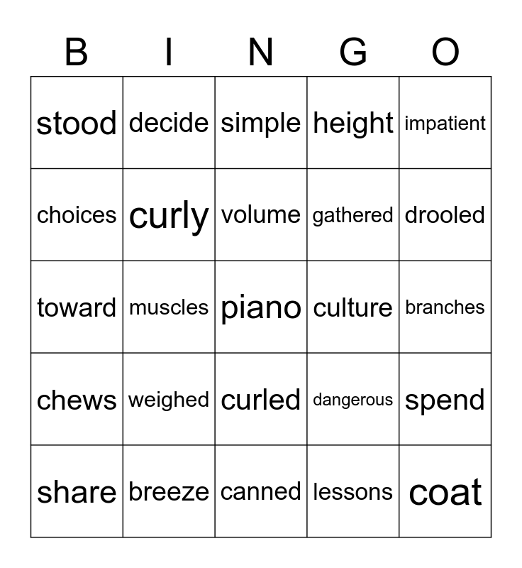 This bingo card has 113 words: blooming, shovels, scent, tough, wrinkled, plain, muscles, nodded, shaped, branches, pond, beaks, wear, deepest, break, hang, winding, floppy, sticky, mammals, judge, curly, scare, collars, wonderful, chews, insects, noises, remembered, screaming, stood, weighed, canned, stuck, coat, bend, suddenly, porch, dangerous, rotten, stayed, damage, prevent, visit, spend, flash, quiet, piano, noticed, litter, bursting, breeze, crown, clipped, sprinkled, hairy, beware, straight, pounding, drooled, share, shaped, row, equal, reach, cousin, tunnel, curled, height, direction, toward, healed, brag, tease, millions, choices, drift, simple, weaker, wrapped, disgusting, decide, understand, gathered, impatient, impossible, believe, problem, demand, furious, vibration, tune, volume, expression, creative, performance, concentrate, relieved, culture, community, languages, transportation, subjects, lessons, special, knowledge, curious, motion, silence, illness, imitated, darkness and behavior.
