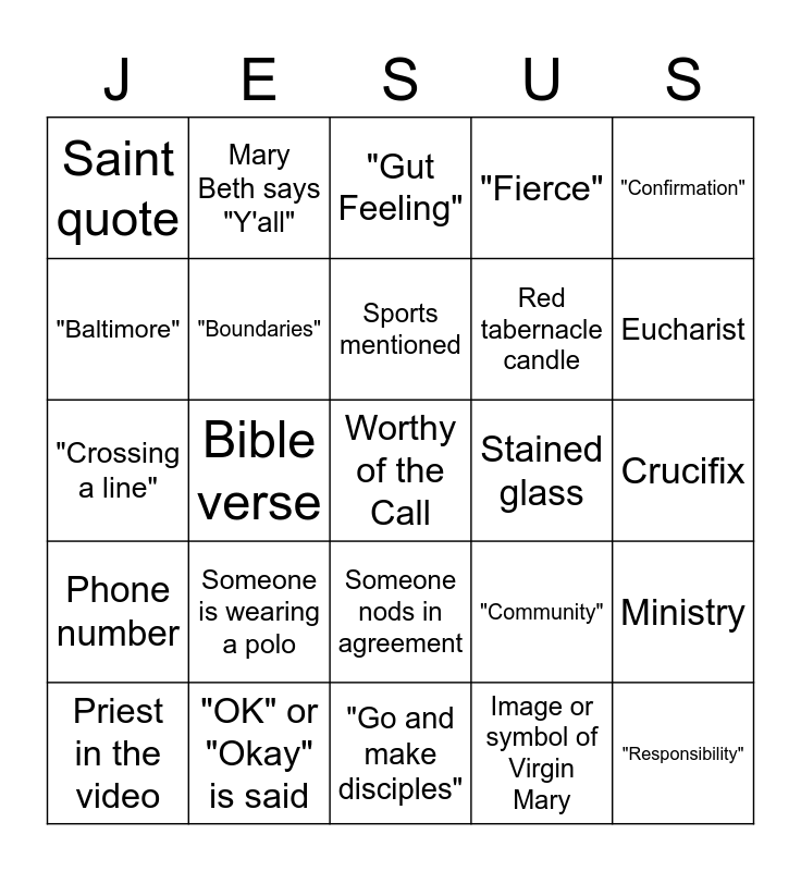 This bingo card has a free space and 24 words: Someone is wearing a polo, "OK" or "Okay" is said, Sports mentioned, Priest in the video, "Confirmation", Saint quote, "Baltimore", Mary Beth says "Y'all", Stained glass, Someone nods in agreement, Red tabernacle candle, "Crossing a line", "Community", Ministry, "Boundaries", Image or symbol of Virgin Mary, Crucifix, "Gut Feeling", Eucharist, Bible verse, "Responsibility", Phone number, "Fierce" and "Go and make disciples".