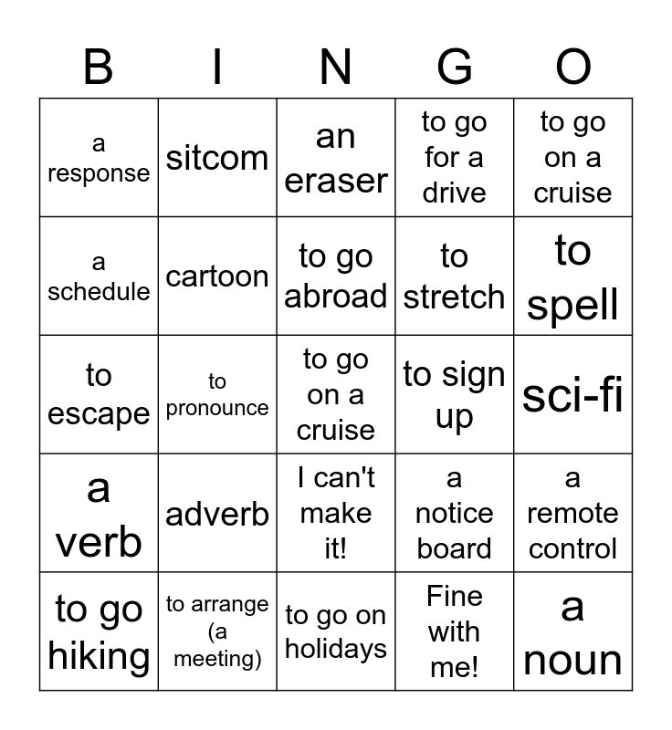 This bingo card has a free space and 24 words: adverb, to arrange (a meeting), to go abroad, to go hiking, to go on a cruise, a response, a schedule, sitcom, to sign up, I can't make it!, to stretch, to escape, a notice board, a remote control, cartoon, Fine with me!, sci-fi, an eraser, to spell, to pronounce, a noun, a verb, to go for a drive and to go on holidays.
