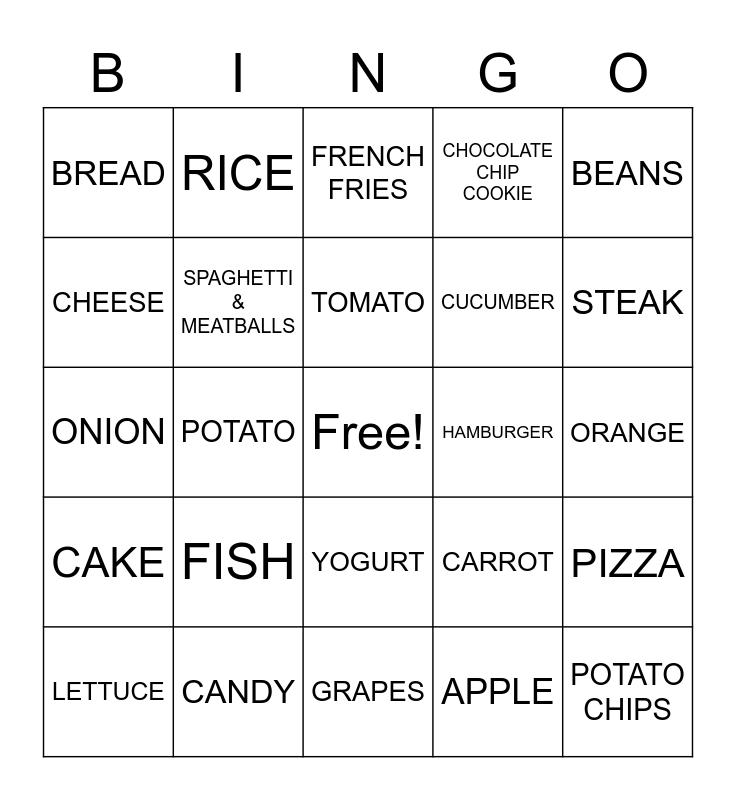 This bingo card has a free space and 28 words: PIZZA, TACO, CUCUMBER, APPLE, CHEESE, FRENCH FRIES, RICE, CAKE, HAMBURGER, LETTUCE, ONION, CHOCOLATE CHIP COOKIE, CANDY, GRAPES, STEAK, WATERMELON, FISH, SPAGHETTI & MEATBALLS, TOMATO, YOGURT, BREAD, PINEAPPLE, POTATO CHIPS, POTATO, ORANGE, CARROT, BEANS and EGGS.