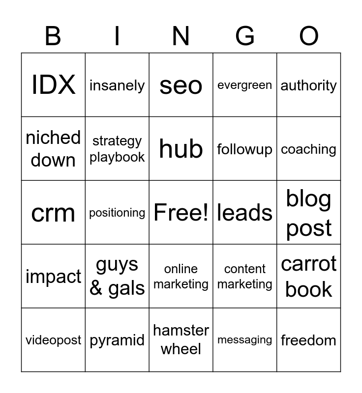 This bingo card has a free space and 24 words: guys & gals, pyramid, hub, videopost, authority, IDX, niched down, insanely, leads, online marketing, followup, crm, content marketing, carrot book, strategy playbook, messaging, blog post, seo, coaching, positioning, freedom, impact, evergreen and hamster wheel.