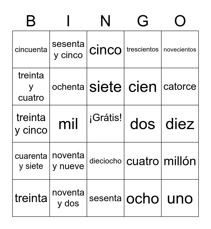 This bingo card has a free space and 55 words: veinte, treinta, cuarenta, cincuenta, sesenta, setenta, ochenta, noventa, cien, doscientos, trescientos, cuatrocientos, quinientos, seiscientos, setecientos, ochocientos, novecientos, mil, cero, uno, dos, tres, cuatro, cinco, seis, siete, ocho, nueve, diez, millón, dos mil, cinco mil, veintidos, veintiocho, treinta y cuatro, treinta y cinco, cuarenta y uno, cuarenta y siete, cincuenta y dos, cincuenta y cuatro, sesenta y cinco, sesenta y siete, ochenta y uno, ochenta y nueve, noventa y nueve, noventa y dos, once, doce, trece, catorce, quince, dieciséis, diecisiete, dieciocho and diecinueve.