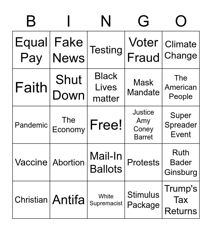This bingo card has a free space and 24 words: Abortion, Antifa, Black Lives matter, Christian, Climate Change, Equal Pay, Faith, Fake News, Justice Amy Coney Barret, Mail-In Ballots, Mask Mandate, Pandemic, Protests, Ruth Bader Ginsburg, Shut Down, Stimulus Package, Super Spreader Event, Testing, The American People, The Economy, Trump's Tax Returns, Vaccine, Voter Fraud and White Supremacist.
