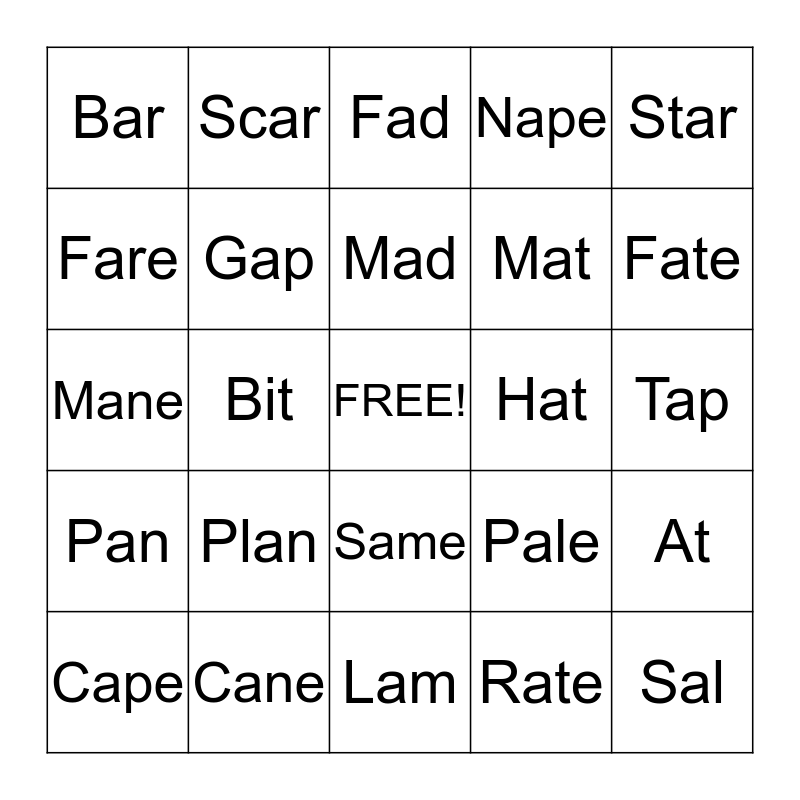 This bingo card has a free space and 24 words: Plan, Cane, Mad, Cape, Star, Bar, Fare, Scar, Hat, Same, Mat, Mane, Pale, At, Gap, Rate, Tap, Fad, Fate, Bit, Sal, Pan, Nape and Lam.