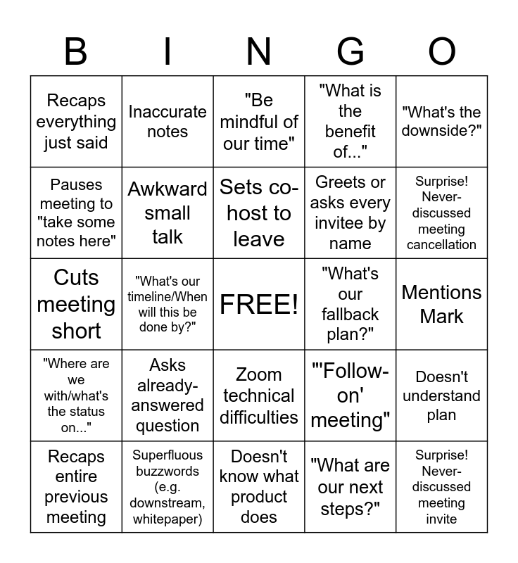 This bingo card has a free space and 24 words: Asks already-answered question, Superfluous buzzwords (e.g. downstream, whitepaper), Sets co-host to leave, Recaps entire previous meeting, "What's the downside?", Recaps everything just said, Pauses meeting to "take some notes here", Inaccurate notes, "What's our fallback plan?", Zoom technical difficulties, Greets or asks every invitee by name, Cuts meeting short, "'Follow-on' meeting", Doesn't understand plan, Awkward small talk, "What are our next steps?", Mentions Mark, "Be mindful of our time", Surprise! Never-discussed meeting cancellation, "What's our timeline/When will this be done by?", Surprise! Never-discussed meeting invite, "Where are we with/what's the status on...", "What is the benefit of..." and Doesn't know what product does.