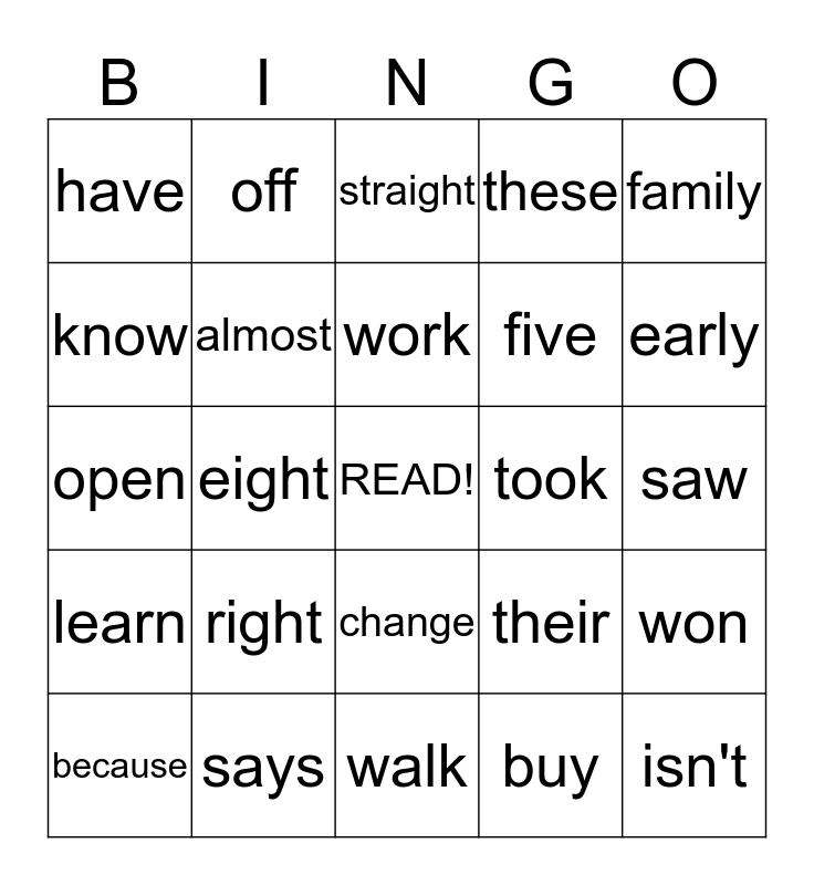 This bingo card has a free space and 24 words: right, says, work, because, family, have, know, off, took, change, five, open, their, won, almost, buy, saw, straight, early, eight, isn't, learn, these and walk.