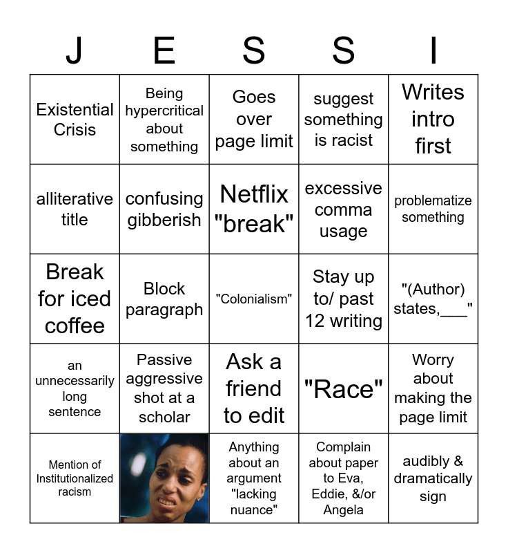 This bingo card has 1 images and 24 words: Passive aggressive shot at a scholar, Anything about an argument "lacking nuance", Netflix "break", Mention of Institutionalized racism, Writes intro first, Existential Crisis, alliterative title, Being hypercritical about something, Stay up to/ past 12 writing, Ask a friend to edit, excessive comma usage, Break for iced coffee, "Race", Worry about making the page limit, confusing gibberish, audibly & dramatically sign, "(Author) states,___", Goes over page limit, problematize something, Block paragraph, "Colonialism", an unnecessarily long sentence, suggest something is racist and Complain about paper to Eva, Eddie, &/or Angela.