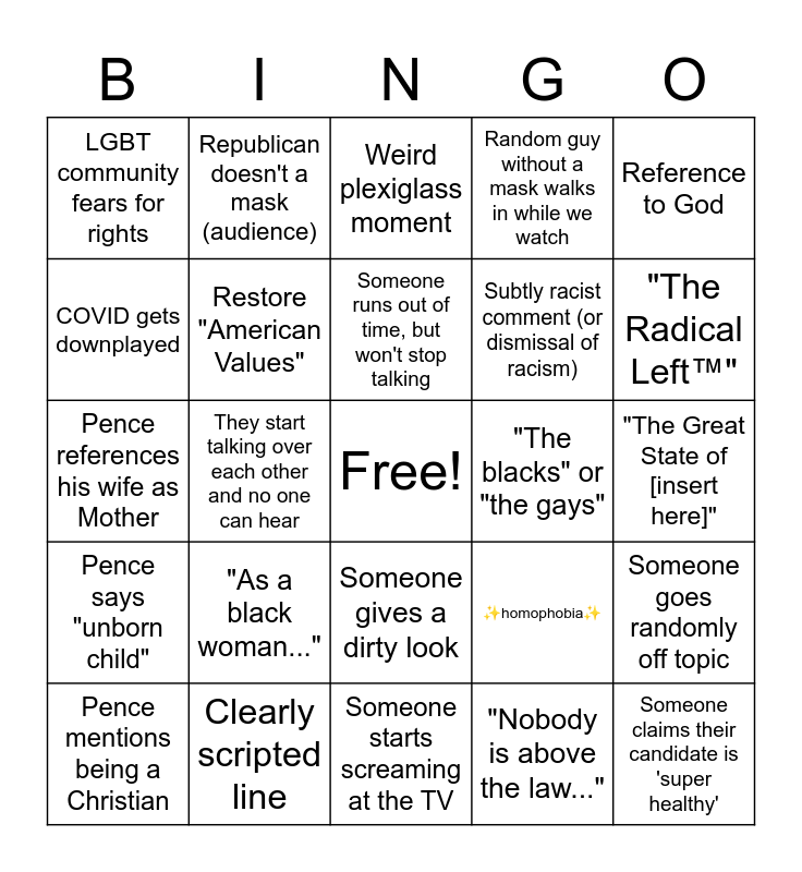 This bingo card has a free space and 24 words: "As a black woman...", Clearly scripted line, Someone runs out of time, but won't stop talking, Pence mentions being a Christian, Reference to God, LGBT community fears for rights, COVID gets downplayed, Republican doesn't a mask (audience), "The blacks" or "the gays", Someone gives a dirty look, Subtly racist comment (or dismissal of racism), Pence references his wife as Mother, ✨homophobia✨, Someone goes randomly off topic, Restore "American Values", "Nobody is above the law...", "The Great State of [insert here]", Weird plexiglass moment, "The Radical Left™️", They start talking over each other and no one can hear, Someone claims their candidate is 'super healthy', Pence says "unborn child", Random guy without a mask walks in while we watch and Someone starts screaming at the TV.