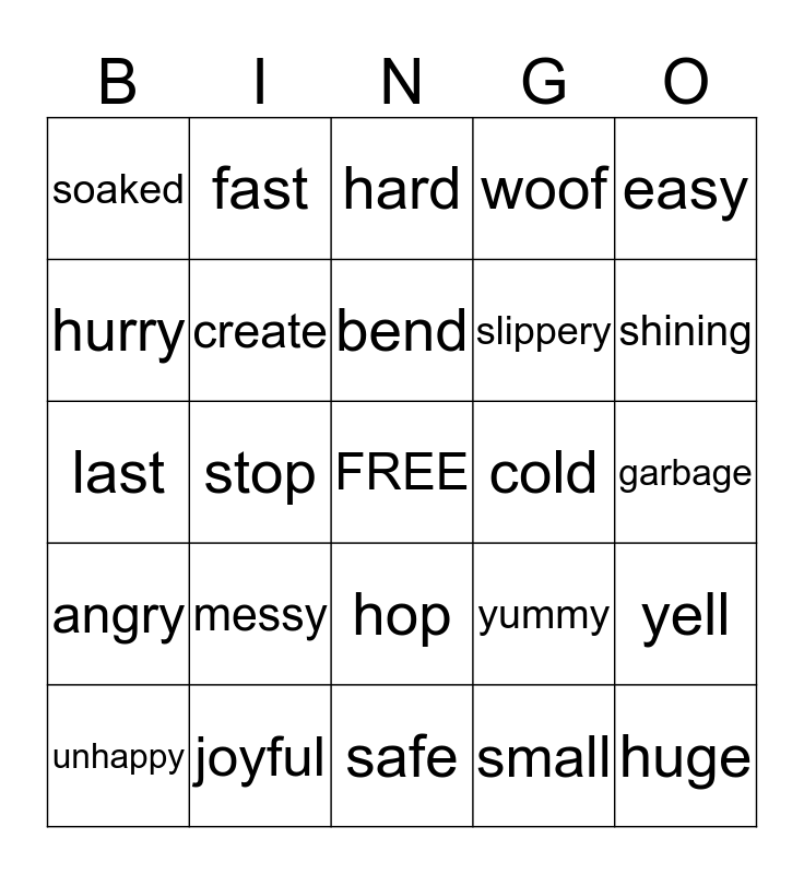 This bingo card has a free space and 24 words: messy, joyful, bend, unhappy, easy, soaked, hurry, fast, cold, hop, slippery, last, yummy, yell, create, small, garbage, hard, shining, stop, huge, angry, woof and safe.