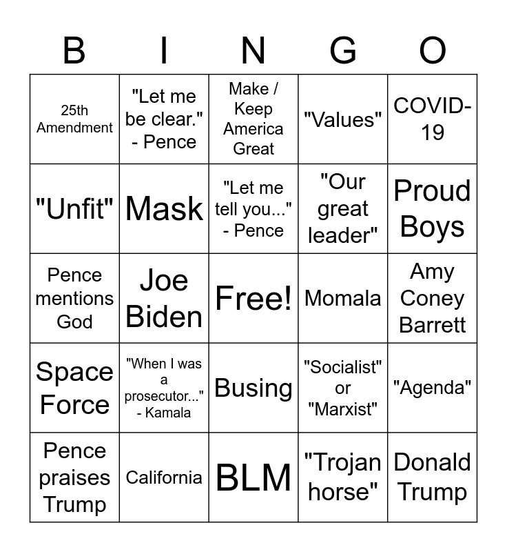This bingo card has a free space and 24 words: "When I was a prosecutor..." - Kamala, California, "Let me tell you..." - Pence, Pence praises Trump, COVID-19, 25th Amendment, "Unfit", "Let me be clear." - Pence, Momala, Busing, "Our great leader", Pence mentions God, "Socialist" or "Marxist", "Agenda", Mask, "Trojan horse", Amy Coney Barrett, Make / Keep America Great, Proud Boys, Joe Biden, Donald Trump, Space Force, "Values" and BLM.