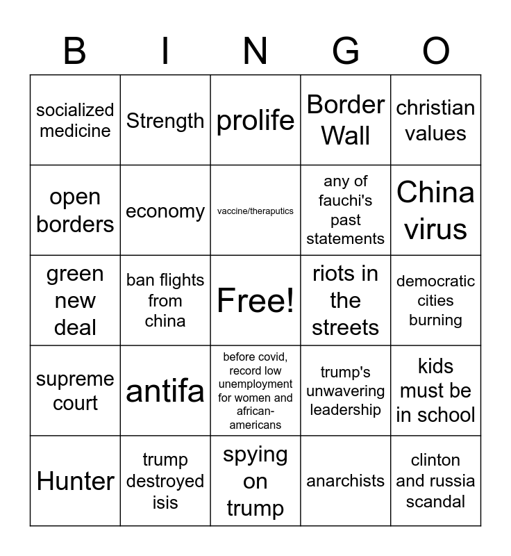 This bingo card has a free space and 29 words: Hunter, socialist, ban flights from china, religious freedom, socialized medicine, prolife, economy, antifa, riots in the streets, trump destroyed isis, democratic cities burning, clinton and russia scandal, spying on trump, anarchists, China virus, biden is controlled by the radical left, before covid, record low unemployment for women and african-americans, supreme court, christian values, green new deal, trump's unwavering leadership, record # of judges, any of fauchi's past statements, open borders, Border Wall, Strength, kids must be in school, vaccine/theraputics and operation warp speed.