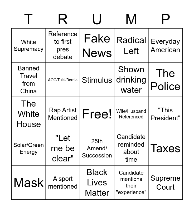 This bingo card has a free space and 39 words: Protest, Riot, Plexi Glass, AOC/Tulsi/Bernie, Mask, 25th Amend/ Succession, Stimulus, China, Everyday American, Solar/Green Energy, Rap Artist Mentioned, Radical Left, Supreme Court, "This President", Wife/Husband Referenced, "Let me be clear", "Woman of color", White Supremacy, Mail-In Voting, Candidate reminded about time, Banned Travel from China, Black Lives Matter, Shown drinking water, The Police, Unemployment, Vaccine, Reference historical event, California, "The worst", Reference to first pres debate, Abortion, Thats not true (or similar), Fake News, A sport mentioned, Candidate mentions their "experience", Regeneron, Taxes, The White House and Quote from someone they love.