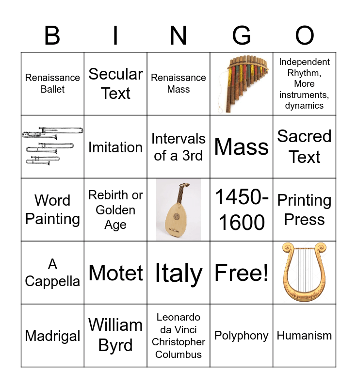 This bingo card has 4 images and 21 words: Motet, Leonardo da Vinci Christopher Columbus, Intervals of a 3rd, Madrigal, Independent Rhythm, More instruments, dynamics, Renaissance Ballet, Secular Text, 1450-1600, Italy, Mass, Word Painting, Free!, Imitation, Humanism, Printing Press, Renaissance Mass, Sacred Text, Rebirth or Golden Age, William Byrd, A Cappella and Polyphony.