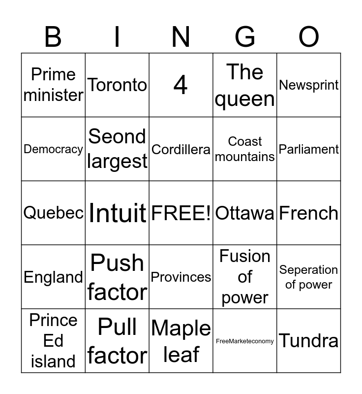 This bingo card has a free space and 24 words: Push factor, Pull factor, Cordillera, Prince Ed island, Newsprint, Prime minister, Democracy, Toronto, Ottawa, Provinces, Coast mountains, Quebec, Fusion of power, Seperation of power, Seond largest, FreeMarketeconomy, French, 4, Parliament, Intuit, Tundra, England, The queen and Maple leaf.